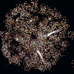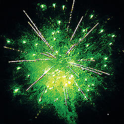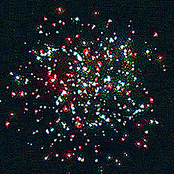 Свистящие серебряные трассы, разноцветные кометы разрываются сферами из: золотых форсов, синих и белых мерцающих огней; золотых форсов, зеленых огней и множества трещащих сфер; красных мерцающих и белых мерцающих огней; множества трещащих сфер; золотых форсов, множества трещащих сфер, красных и зеленых огней.