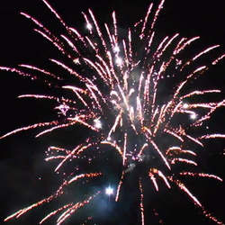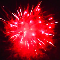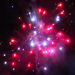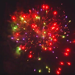 Белая комета раскрывается красной пальмой и переходит в зеленую хризантему. Зеленая жирная пальма переплетается с красной хвостатой хризантемой. Прекрасный финальный залп всех пальм вместе
