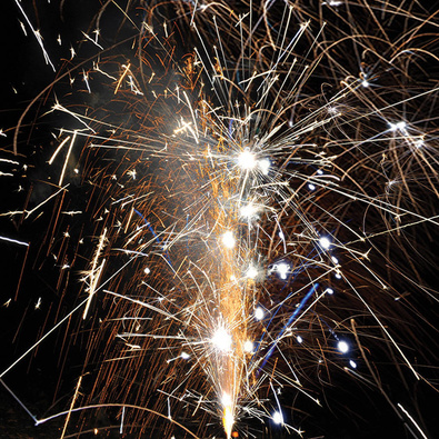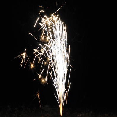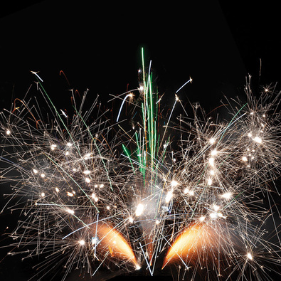 Поток ниспадающих золотых и серебряных искр, крупных трещащих серебряных и цветных огней. Веер: 3 потока золотых ниспадающих звёздочек. Веер: 3 потока крупных серебряных огней.