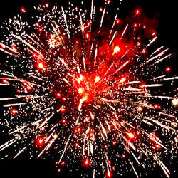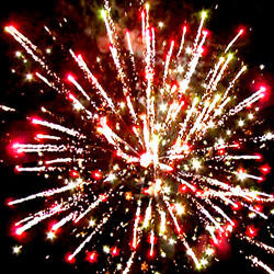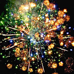 Множество золотых и серебряных ниспадающих нитей, мерцание. Разноцветные звезды с пышными хвостами и треск. Цветные сферы и кометы с трещащими хвостами.
