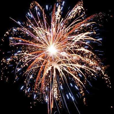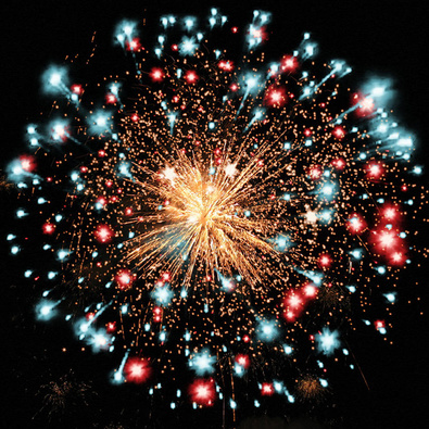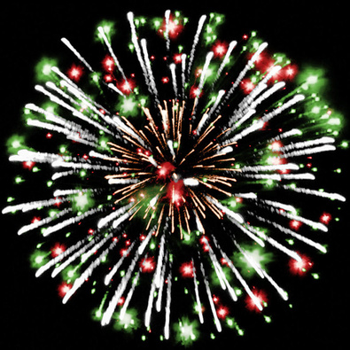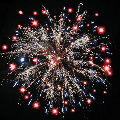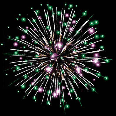 Разноцветные кометы разрываются сферами из форсов с серебряными трещащими искрами и цветными мерцающими огнями.