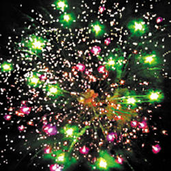 Красно-зеленая сфера (пион) и облако треска (трещащая хризантема). Фиолетово-зеленая мерцающая сфера (пион). Множество золотых ниспадающих нитей (парча) и белое мерцание. Разрыв фиолетовыми звездами с пышными хвостами (кокос) и облаком треска (трещащий дождь).