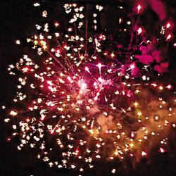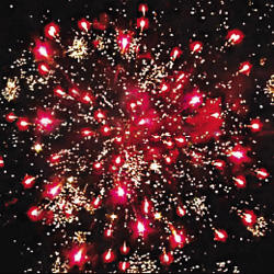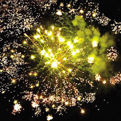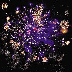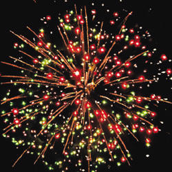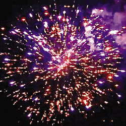 Множество золотых и серебряных ниспадающих нитей. Облако треска. Цветные звезды с пышными хвостами. Сфера золотых хвостов. Мерцание. Серебряная вертушка разрывается шуршащими разлетающимися кометами. Свист.