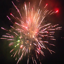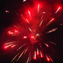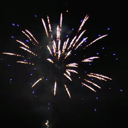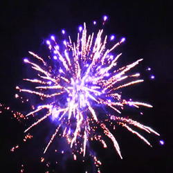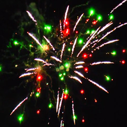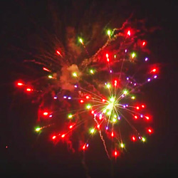 Зеленые звезды с треском, красные блестки с бисером, трещащие звезды с мерцанием, синие звезды в трещащем облаке, мерцающие пионы и трещащие хризантемы в финале