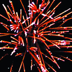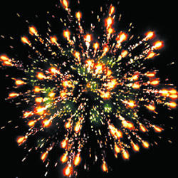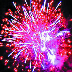 Желтые звезды с пышными хвостами (кокос) и зеленое мерцание. Красно-синяя сфера (пион) и облако трещащих разрывов (трещащая хризантема). Серебряные звезды с пышными хвостами (кокос) и красные звезды. Серебряные звезды с пышными трещащими хвостами (трещащий кокос) и красно-сине-зеленые звезды. Красные мерцающие хвосты (мерцающая ива). Множество золотых ниспадающих нитей (парча), красные звезды и облако трещащих разрывов (трещащий дождь). Красочная концовка: множество серебряных ниспадающих нитей (парча), красно-зелено-синие звезды и белое мерцание.
