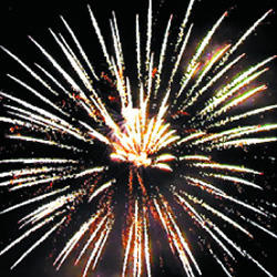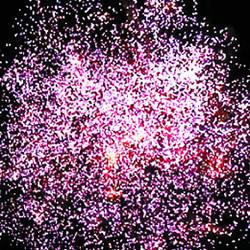 Крупные красные звезды и белое мерцание. Крупные зеленые звезды и белое мерцание. Сине-белое мерцание. Комета с хвостом разрывается сферой из множества ниспадающих серебряных нитей (парча). Комета с хвостом разрывается облаком трещащих разрывов (трещащая хризантема).