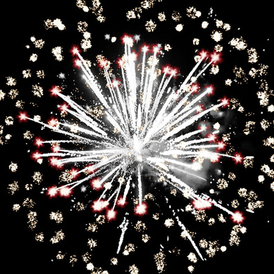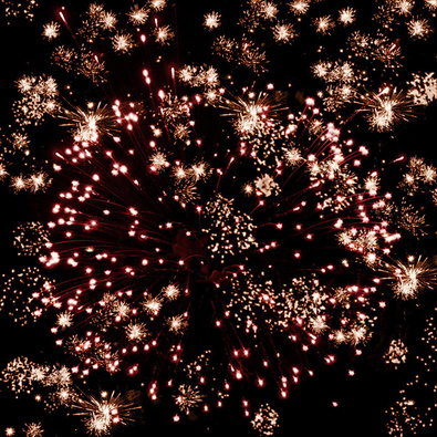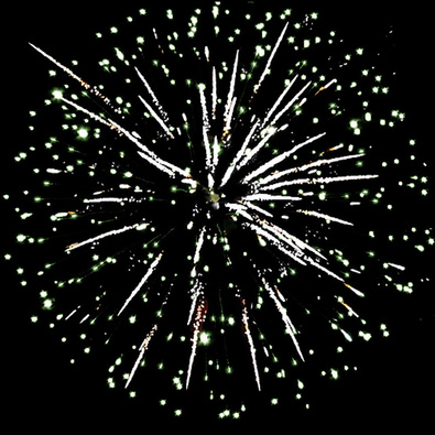Разноцветные кометы разрываются сферами из цветных мерцающих огней, серебряных форсов с трещащими искрами и множества золотых трещащих сфер.