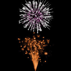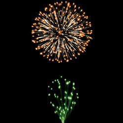 Золотые трещащие букеты. Букеты из цветных огней. Разноцветные кометы разрываются сферами из цветных мерцающих огней и золотых форсов.
