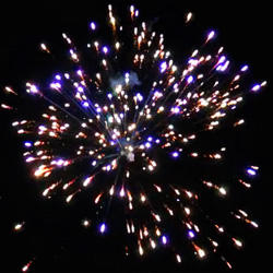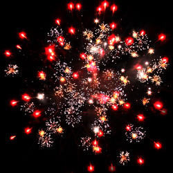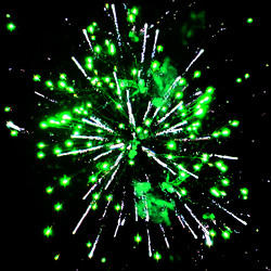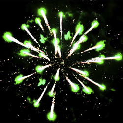 Россыпь фиолетового жемчуга с белыми мерцающими огоньками. Зеленые кометы с пышными хвостами с белыми мерцающими огоньками. Зеленые кометы с пышными хвостами с золотыми мерцающими звездами. Красные трещащие георгины. Парчовые короны с зелеными мерцающими звездами.