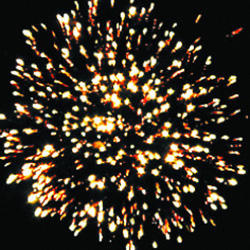 Множество золотых ниспадающих нитей (парча). Зеленая сфера (пион) и треск. Белая мерцающая сфера (мерцающий пион).