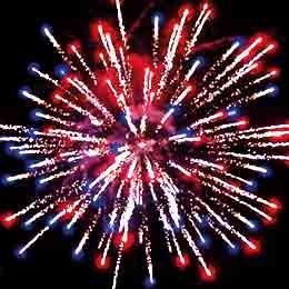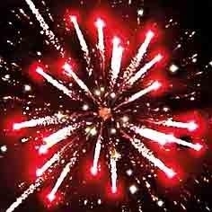Красные, синие, зеленые звезды с белыми хвостами, треском и белым мерцанием. Белые кометы и облако трещащих разрывов.