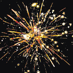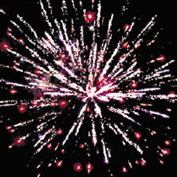 Красно-зелено-синяя сфера (пион). Серебряные звезды с пышными хвостами (кокос) и красное мерцание. Множество золотых ниспадающих нитей (парча) и треск.