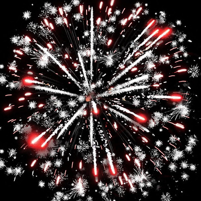 Разноцветные кометы разрываются сферами из серебряных форсов с цветными огнями и множеством трещащих сфер.