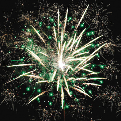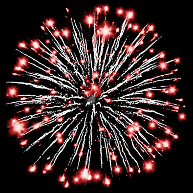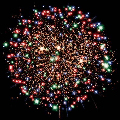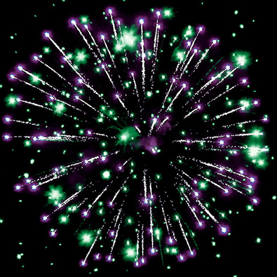 Разноцветные кометы разрываются сферами из серебряных искристых форсов и цветных мерцающих огней, серебряных форсов и множества трещащих серебряных искр.