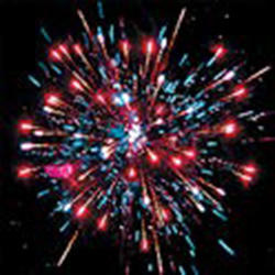 Разноцветные кометы разрываются сферами из золотых искристых форсов, крупных цветных пкльсирующих огней с серебряными форсами в центре.