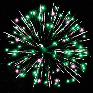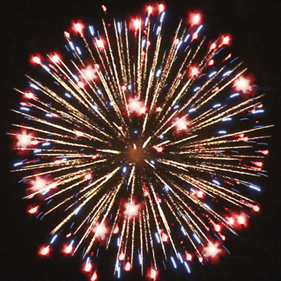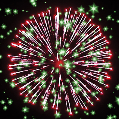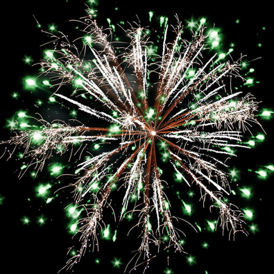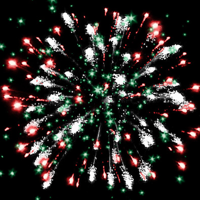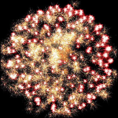 Разноцветные кометы, свистящие элементы разрываются сферами из коротких золотых и серебряных форсов с трещащими искрами, цветных мерцающих огней.