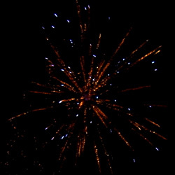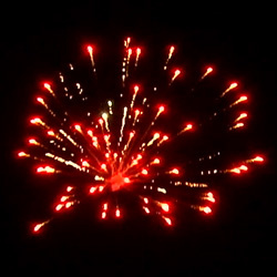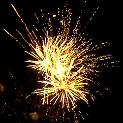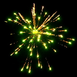 Чередующиеся разрывы из букетов, цветные огни и форсовые золотые трассы, белое мерцание, трещащие искры.