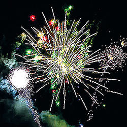 2 уровня. Нижний уровень. букет из красных и трещащих огней; букет из зеленых и трещащих огней; букеты из золотых форсов с трещащими искрами (веер S); букет из синих и трещащих огней внизу и букетики из синих и трещащих серебряных огоньков наверху (веер W); Разноцветные кометы разрываются сферами из: фиолетовых, зеленых и трещащих огней; голубых огней и множества трещащих сфер; серебряных искристых форсов, фиолетовых огней и множества трещащих сфер; серебряных искристых форсов, синих огней и множества трещащих сфер; золотых форсов с трещащими серебряными искрами и желтых огней; серебряных искристых трещащих форсов и красных огней; серебряных искристых трещащих форсов и голубых огней; веер: боковые ветви – серебряные трассы с белыми мерцающими искрами; центр – золотые трассы с красными мерцающими искрами разрываются сферами из золотых форсов с красными мерцающими искрами; веер: боковые ветви – серебряные искристые трассы; центр – сферы из золотых форсов , красных и зеленых огней.