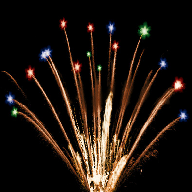 Свистящие элементы, разноцветные кометы разрываются сферами из цветных мерцающих огней, золотых форсов. Веер. Последовательно вылетают искристые трещащие трассы и разноцветные огни. Множества трещащих сфер.