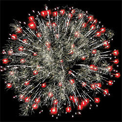 Разноцветные кометы разрываются сферами из серебряных форсов, цветных мерцающих огней и множества трещащих сфер.