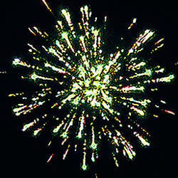 Разноцветные кометы разрываются сферами из: красных, зеленых и синих огней; золотых форсов с зелеными огнями на концах и серебряных мерцающих огней; золотых форсов с красными огнями на концах и синих огней; золотых искристых форсов и зеленых мерцающих огней.