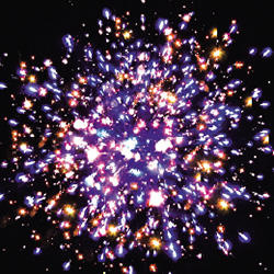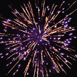 Множество золотых ниспадающих нитей (парча) и красное мерцание. Красные звезды с пышными хвостами (кокос) и белое мерцание. Множество золотых ниспадающих нитей (парча) и синие звезды. Сине-золотая мерцающая сфера (пион). Зеленые звезды с пышными хвостами (кокос) и треск. Множество серебряных ниспадающих нитей (парча) и фиолетовые звезды. Красочная концовка. ЗАЛП: Красная сфера (пион) и облако треска (трещащий дождь).