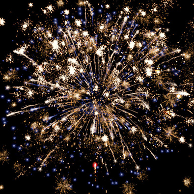 Разноцветные кометы разрываются сферами из цветных мерцающих и трещащих огней.
