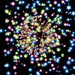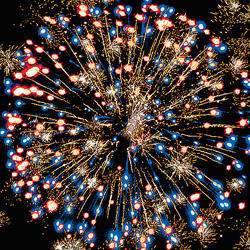 Разноцветные кометы разрываются сферами из цветных мерцающих огней, серебряных форсов и трещащих огней.