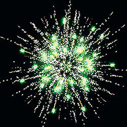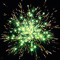 Разноцветные кометы разрываются сферами из: зеленых и золотых мерцающих огней; зеленых огней и множества трещащих сфер.