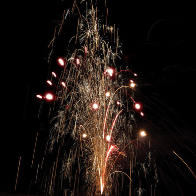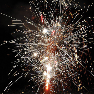 Поток ниспадающих серебряных огоньков и цветных огней. Трещащие золотые разлетающиеся искры.