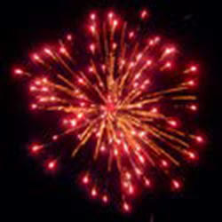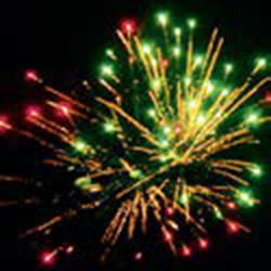 Золотые трассы разрываются сферами из: золотых искристых форсов и красных огней; золотых искристых форсов и зеленых огней; золотых трещащих огней.