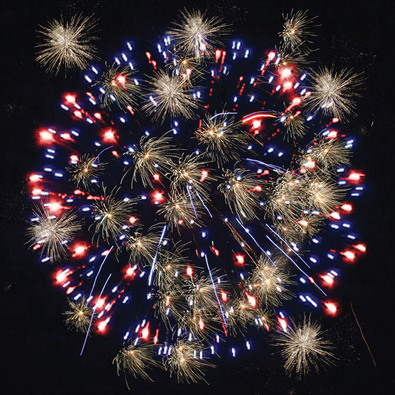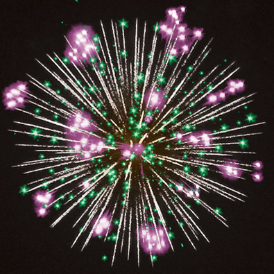 Разноцветные кометы разрываются сферами из цветных, золотых и серебряных мерцающих огней с трещащими искрами и серебряными форсами.