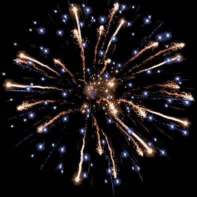 Разноцветные кометы разрываются сферами из серебряных мерцающих огней, форсов с цветными огнями на концах.