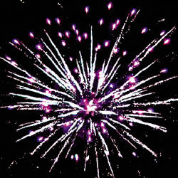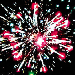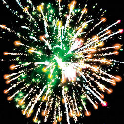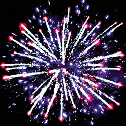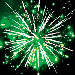 Множество серебряных ниспадающих нитей (парча) и фиолетовые звезды. Красные звезды с пышными хвостами (кокос) и синие звезды Оранжевые звезды с пышными хвостами (кокос) и зеленое мерцание. Множество серебряных ниспадающих нитей (парча) и зеленые звезды. Красно-синяя сфера (пион) и облако треска (трещащая хризантема). Красные звезды с пышными хвостами (кокос) и белое мерцание. ЗАЛП: Множество серебряных ниспадающих нитей (парча), красно-белая мерцающая сфера (пион) и облако треска (трещащая хризантема).
