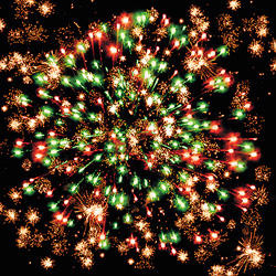 Разноцветные кометы разрываются сферами из золотых искристых форсов, цветных трещащих и мерцающих огней.