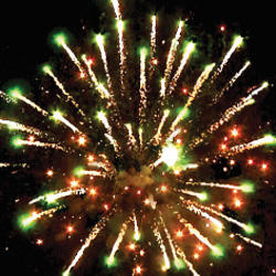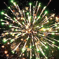 Разноцветная мерцающая сфера. Цветные звезды с пышными хвостами и облако треска. Разрыв трещащими хвостами.