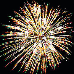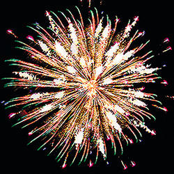 Разноцветные кометы разрываются сферами из: форсов из трещащих разлетающихся серебряных искр, фиолетовых и синих огней; форсов из трещащих разлетающихся серебряных искр, красных и зеленых мерцающих огней.