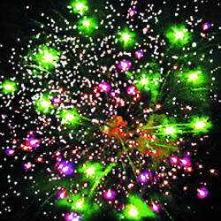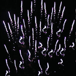 Красно-синяя сфера (пион) и белое мерцание. Мерцающие серебряные хвосты (мерцающая волна) и синие звезды. Оранжевые кометы с пышными хвостами. Зелено-фиолетовая сфера (пион) и облако трещащих разрывов (трещащая хризантема). Зеленые шуршащие разлетающиеся кометы (паучки). Свистящие змейки. 7Красочная концовка: Красные мерцающие хвосты (мерцающая ива).