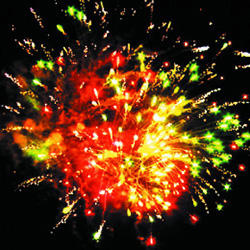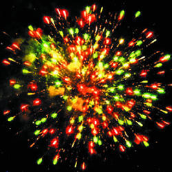 Красно-зеленая сфера (пион) с переходом в белые хвосты (кокос). Желто-фиолетовая сфера (пион) с переходом в белые хвосты (кокос). Красная сфера (пион) с переходом в белые хвосты (кокос) и треск. Зелено-красно-синяя сфера (пион) и белое мерцание. Фиолетово-желтая сфера (пион) и треск. Красно-зелено-синяя сфера (пион) и треск. Красно-зеленая сфера (пион) с переходом в белые хвосты (кокос). Красочная концовка. Звезды с пышными золотыми хвостами (кокос) и белое мерцание.