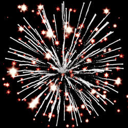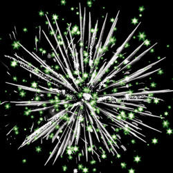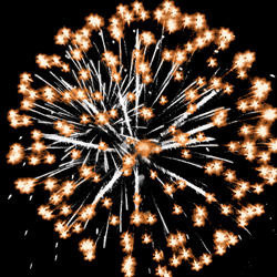 Золотые трассы с мерцающими цветными и трещащими искрами разрываются сферами из серебряных форсов и мерцающих огней. Множество трещащих сфер.
