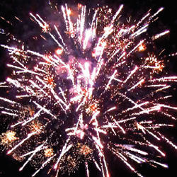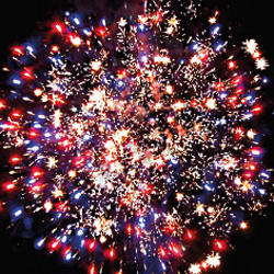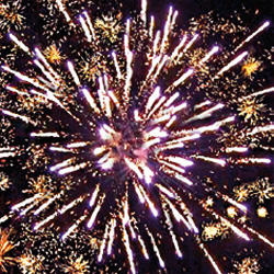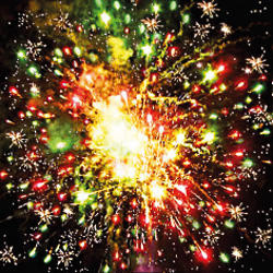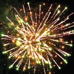Разноцветные звезды с пышными хвостами и облако треска. Золотое мерцание. Множество золотых и серебряных ниспадающих нитей. Цветная сфера, мерцающий разрыв переходит в белые хлопья. Облако треска с белым мерцанием.