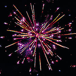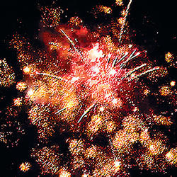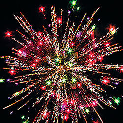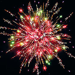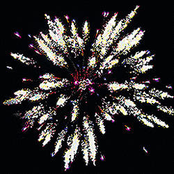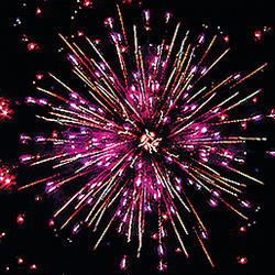 Разноцветные кометы, золотые трассы разрываются сферами из: швермеров, фиолетовых и синих огней; синих огней и золотых форсов с красными мерцающими искрами; фиолетовых огней и золотых форсов с серебряными мерцающими искрами; трещащих искристых форсов, красных и зеленых огней; трещащих искристых форсов, синих и фиолетовых огней; множества золотых трещащих сфер и золотых форсов с оранжевыми огнями на концах; золотых форсов, красных, зеленых и синих огней; мелких серебряных огней с оглушительным звуком.