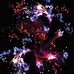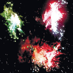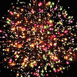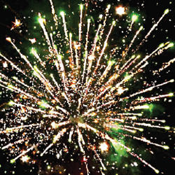Разноцветные звезды с пышными хвостами. Множество золотых и серебряных ниспадающих нитей, мерцание. Цветная сфера. Букеты трещащих звезд. Хаотично разлетающиеся серебряные огоньки. Свист. Облако треска.