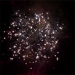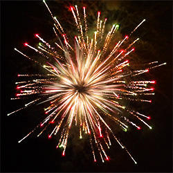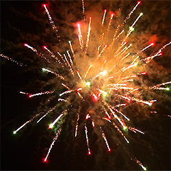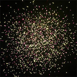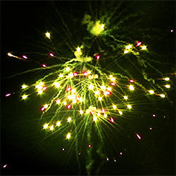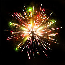 Разноцветные кометы разрываются сферами из: фиолетовых и жёлтых огней, серебряных форсов с разноцветными огнями на концах, фиолетовых, красных и трещащих огней; красных, зелёных и белых мерцающих огней, фиолетовых, голубых и зелёных мерцающих огней, синих и красных мерцающих огней, серебряных форсов с красными огнями на концах и трещащих огней, серебряных форсов с зелёными огнями на концах и трещащих огней, золотых форсов с серебряными и фиолетовыми искрами, красных огней и золотых форсов с серебряными шуршащими искрами, зелёных огней и золотых форсов с серебряными шуршащими искрами, красных, зелёных, синих огней и множества трещащих сфер, красных, зелёных, синих огней и множества золотых разлетающихся трещащих искр.
