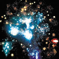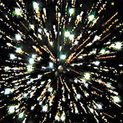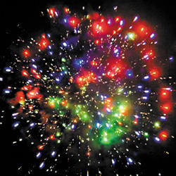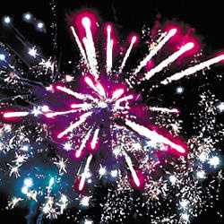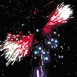 Красные звезды с пышными хвостами (кокос) и белое мерцание. Красно-зелено-синяя сфера (пион) и треск. Множество серебряных ниспадающих нитей (парча) и белые звезды. Фиолетовые звезды с пышными хвостами (кокос) и облако треска (трещащий дождь). Выстреливает подряд: Мерцающие букеты. Облако золотого треска (трещащая хризантема). Красочная концовка: ЗАЛП - облако треска (трещащая хризантема).