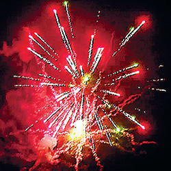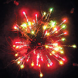 Разноцветные кометы разрываются сферами из: золотых форсов с золотыми искрами, зеленых мерцающих и синих огней; серебряных искристых трещащих форсов с красными и зелеными огнями на концах; золотых искристых форсов с красными и зелеными огнями на концах; золотых искристых форсов и трещащих огней.