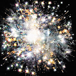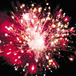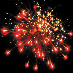 Красные звезды с пышными хвостами (кокос), золотое мерцание и фиолетовые звезды. Красно-белое мерцание и трещащие разрывы (трещащий дождь). Белое мерцание и трещащие разрывы (трещащий дождь). Золотое мерцание и красное мерцание. Красочная концовка: Множество серебряных ниспадающих нитей (парча) и синие звезды.