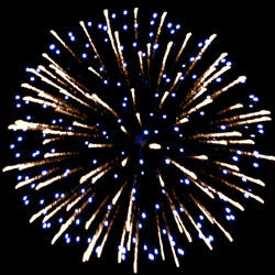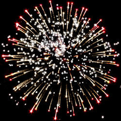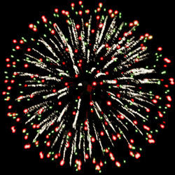 Разноцветные кометы разрываются сферами из золотых и серебряных форсов с цветными, трещащими и мерцающими огнями на концах.