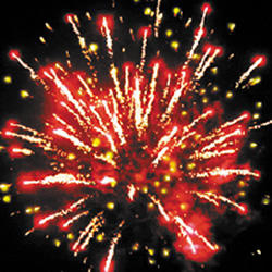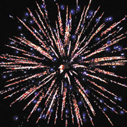 Зелено-белая мерцающая сфера (пион). Красные звезды с пышными хвостами (кокос) и треск. Фиолетово-зелено-белая мерцающая сфера (пион). Множество серебряных ниспадающих нитей (парча) и синие звезды.