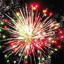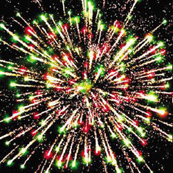 Множество серебряных ниспадающих нитей (парча) с красными и зелеными звездами на концах и треск. Разрыв шуршащими хвостами (снежные хлопья) и красным мерцанием. Красные и зеленые звезды с пышными хвостами (кокос) и облако треска (трещащий дождь). Красно-сине-белая мерцающая сфера (пион). Красочная концовка. ЗАЛП: Трещащие золотые хвосты (трещащая ива) и красное мерцание.